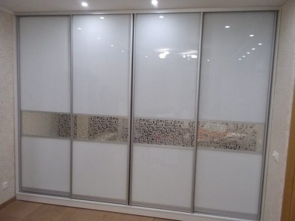 | Фасад | Раздвижная система Senator, комбинация стекло белый лакобель с горизонтальными вставками зеркала с нанесенным пескоструйным рисунком |
